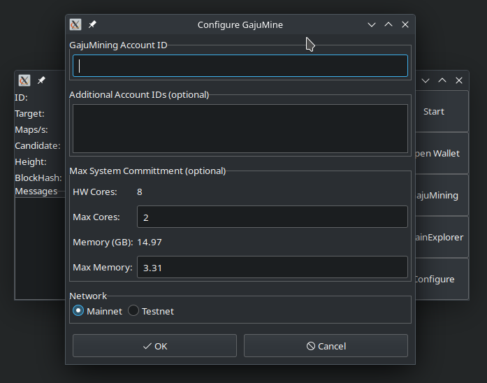 Adding a config interface to the miner as a proper first class window instead of a modal. ![Screenshot_20250527_211133.png](/attachments/af018100-b1dc-485b-b185-130794a77599) This change also adds the ability for the user to provide preferences for max memory consumption and processing core commitment, and configuration of additional beneficiary keys on whose behalf to mine. This version also eliminates the need for passwords, as configuration only makes use of the public key, and key generation is left entirely to GajuDesk.